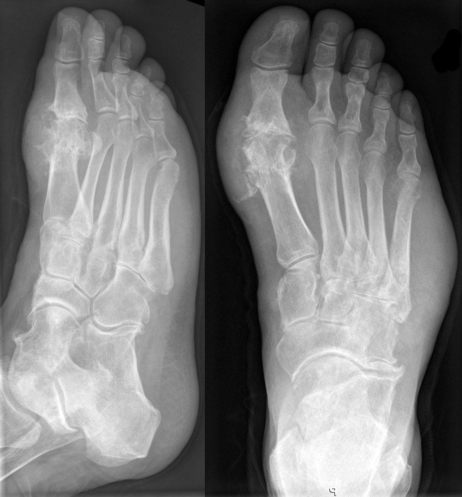 Диагноз выставляется на основании жалоб пациента, анамнестических данных, результатах инструментальных, биохимических исследований. При внешнем осмотре изучается физикальный статус — оценивается положение и форма стопы, характер активных, пассивных движений. Пальпация дистального отдела ноги позволяет обнаружить воспалительную отечность, гиперемию.