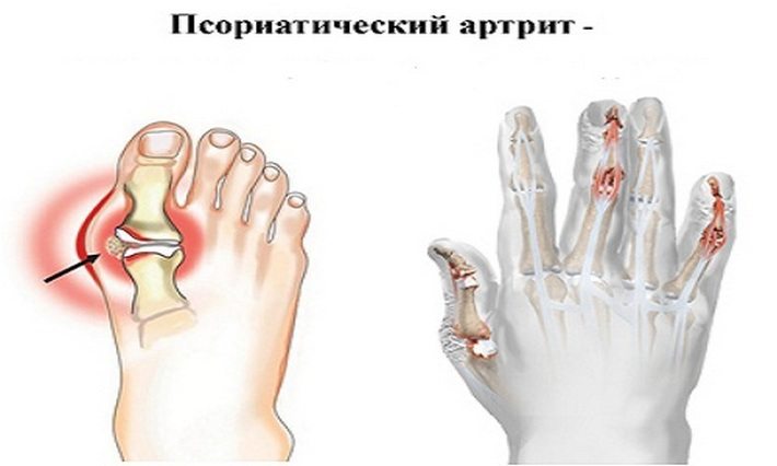 Псориатический артрит ассоциирован с кожной формой псориаза. В большинстве случаев вначале на коже формируются папулы, бляшки и только затем возникают признаки развития воспалительного процесса в межфаланговых суставов пальцев рук, плюсне- и пястно-фаланговых, коленных, плечевых сочленениях. Псориатический артрит у детей выявляется крайне редко, но протекает значительно тяжелее, чем у взрослых.
