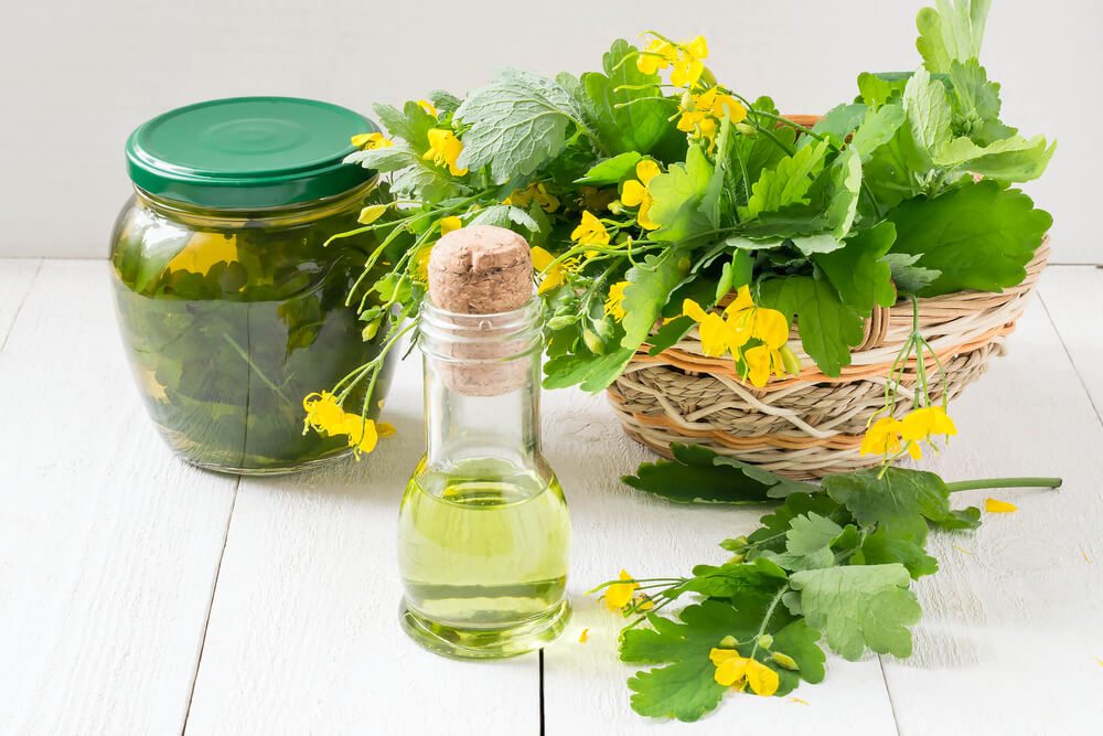 Емкость из темного стекла заполняют на 1/3 объема свежей травой чистотела, слегка утрамбовывают. Заполняют банку до верха любым растительным маслом (оливковым, подсолнечным, кукурузным), оставляют при комнатной температуре на месяц. Процеживают, втирают в колени при болях.