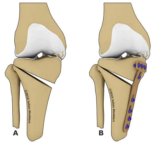 - околосуставная остеомия. Эта операция считается очень сложной, поэтому проводится в редких случаях. Она предусматривает подпиливание костей в некоторых местах и их последующее соединение под необходимым углом. Это дает возможность перераспределить нагрузку. Эффект после операции длится не более 5 лет. Однако она эффективна только на ранних стадиях развития. Кроме того, данное вмешательство требует длительного периода восстановления;