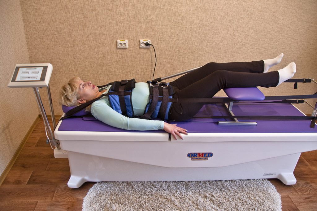 Проводится процедура с использованием специального тракционного аппарата. Реже ее практикуют мануально. Цель — уменьшение нагрузки на ТБС.
