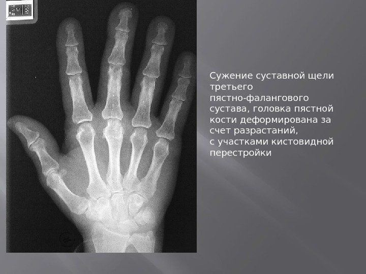 - III (заключительная) стадия деформирующего артроза – это разрушение поверхностного слоя межфаланговых суставов. Костные разрастания увеличены, сливаются между собой. Искривленная деформация, срастание суставных концов сочленяющихся поверхностей приводят к полной неподвижности суставов. На этом этапе развития болезни отмечается выраженная болевая симптоматика постоянного характера.