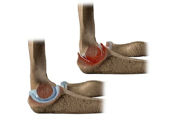 Патологические изменения развиваются вследствие функциональной перегрузки сустава: в нем возникает нарушение кровообращения и ухудшение питания хрящевой ткани. Из-за происходящих изменений она истончается и деформируется. Хрящ перестает быть эластичным, появляются трещины, суставные поверхности приобретают «шероховатые» очертания. При движении и нагрузке на сустав ощущается дискомфорт и боль в локте, которая со временем приобретает интенсивный характер.