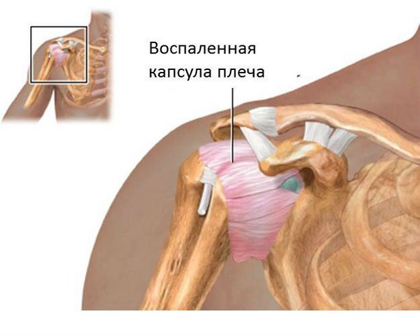 При капсулите значительно снижается размер капсулы, окружающей сочленение, в близлежащих тканях развиваются адгезивные изменения, что и вызывает боль от плеча до локтя.