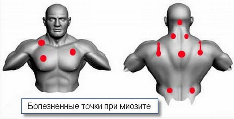 Для миозита характерна ноющая боль в мышцах пораженной руки, начинающаяся сверху и отдающая в локоть. Под кожей прощупываются плотные узелки и тяжи. Довольно часто миозит сопровождается лихорадкой, с ознобом, повышением температуры. Кожа в очаге воспаления краснеет и отекает.