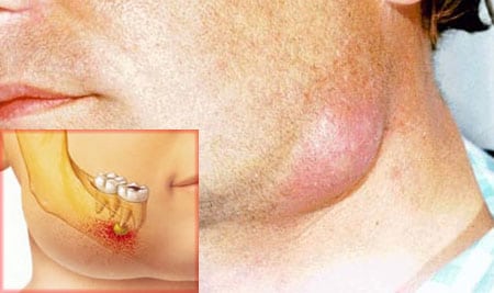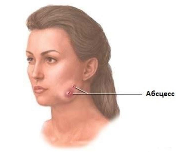- абсцесс челюстной области. В соединительнотканных структурах формируется ограниченная от окружающих тканей и заполненная гнойным содержимым полость. Для абсцесса характерны отечность, повышенная температура тела, болезненность кожи, флюктуация, головные боли, гиперемия, недомогание, расстройство сна.