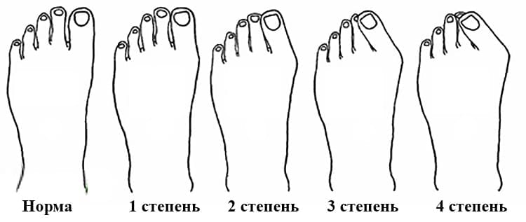 Косточка растет постепенно, с усугублением симптоматических проявлений. Физиологическое отклонение большого пальца от плюсневой кости – 10 градусов.