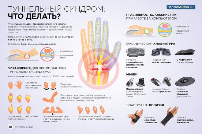 Причина появления туннельного синдрома — любая патология, провоцирующая уменьшение объема запястного канала (артроз, артрит, липома). В результате происходит компрессионно-ишемическое поражение серединного нерва. Возникают боли, снижается чувствительность, пациенты жалуются врачу на ощущения онемения, чувства покалывания, ползания мурашек. Любое движение кистью сопровождается слабостью, особенно если требуется захватить предмет большим пальцем.