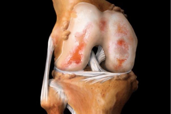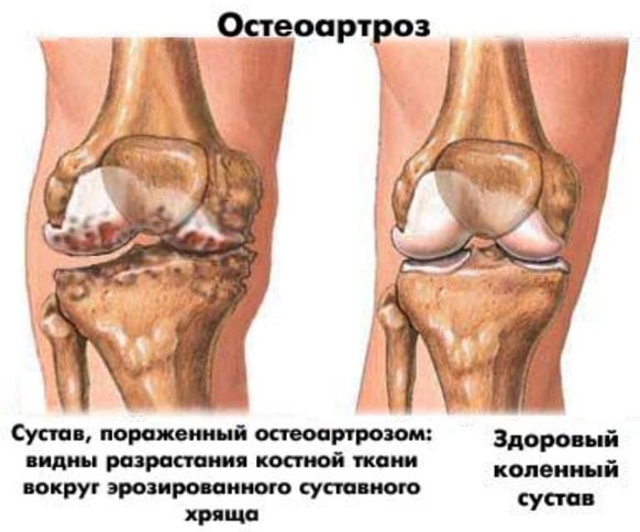 - остеоартроз — рецидивирующее заболевание, сопровождающееся постепенным разрушением хрящевых тканей. Для стабилизации сустава в организме запускается процесс формирования остеофитов (разрастания краев костных пластинок). Во время ходьбы они сдавливают чувствительные нервные корешки, провоцируя сильные боли. Дискомфорт в коленях после тренировок объясняется и травмированием расположенных поблизости мягких тканей;