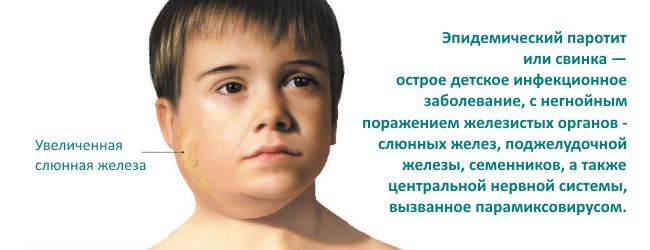В народе заболевание хорошо известно, как «заушница» или «свинка». Для инфекционного паротита характерно острое воспаление околоушных слюнных желез, вызывающее сильные боли и отек в области шеи, затылка и за ушами. Внешний вид ребенка напоминает поросенка.