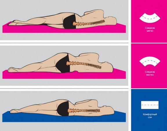 - Слишком мягкий матрас. Если матрас не ортопедический, отличается излишней мягкостью и легкостью, то позвоночник при сне на такой постели как бы проваливается и находится в нефизиологичном положении, что также является причиной напряжения в спине по утрам. Матрас желательно выбрать средней жесткости, с хорошим наполнителем, поддерживающим спину в анатомически правильной форме. Для детей, у которых позвоночник и его система только формируется, необходимы ортопедические матрасы.
