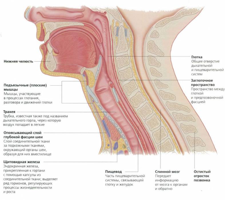 Если у вас болит горло внизу шеи, вам стоит заподозрить фарингит или трахеит (воспаление гортани или трахеи). Развитие заболеваний провоцируют вирусная инфекция, вдыхание горячего, холодного или загрязненного воздуха. Если же болит горло и шея сзади, возможен заглоточный абсцесс. Для патологии характерно повышение температуры, трудности при глотании, потеря аппетита, общая слабость и апатия.