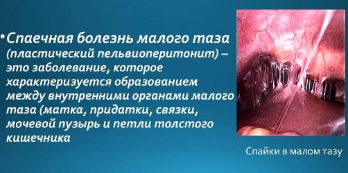 В результате хронического воспаления, травм, хирургического вмешательства развивается спаечная болезнь. Спайками называются тяжи из соединительной ткани, которые покрывают поверхность тазовых органов, соединяют их между собой. Для патологии характерны постоянные или эпизодические боли внизу живота. Во время или после полового акта они могут иррадиировать в бока или область поясницы. На фоне формирования спаек часто расстраиваются пищеварение и перистальтика. Женщины страдают от запоров, частых позывов к опорожнению кишечника, избыточного газообразования. Опасные осложнения спаечной болезни — невынашивание беременности или бесплодие.