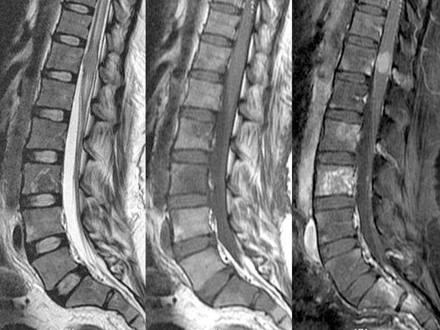 - МРТ или КТ. Диагностические мероприятия более информативны, чем рентгенография, позволяют выявить сужение позвоночного канала, деструкцию межпозвонковых дисков, тел позвонков. На полученных изображениях хорошо визуализируются кровоизлияния, неоплазии;