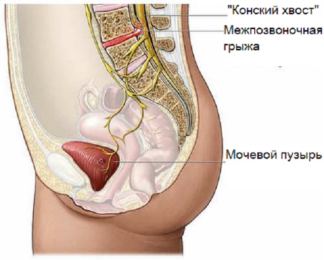В области пояснично-крестцового отдела позвоночника находятся спинномозговые корешки, иннервирующие органы мочевыделительной системы. При их компрессии или воспалении нарушается передача импульсов в центральную и периферическую нервные системы. Больной не ощущает, что его мочевой пузырь переполнен, так как не возникает позывов к мочеиспусканию. Если на начальном этапе патологии возникают только трудности с мочеиспусканием, то на конечной стадии у человека диагностируется недержание мочи. Это еще более ухудшает психоэмоциональное состояние больного, приводит к возникновению депрессий и неврозов.