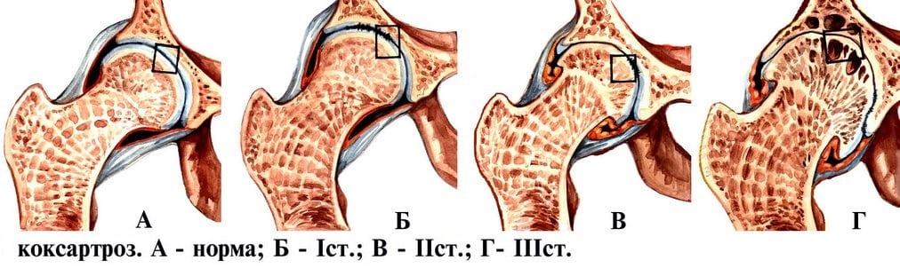 | Стадии разрушения тазобедренного сустава | Характерные симптомы и рентгенологические признаки |