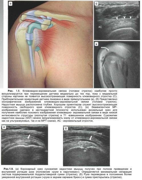 Проведено много клинических испытаний для сравнения эффективности методик диагностирования патологических изменений в плечевом суставе. Помимо того, что ультразвуковое исследование технически просто, отличается бюджетной стоимостью, его преимущество перед МРТ — в неиспользовании энергии магнитного поля. Ультрасонография может быть применена при обследовании пациентов с имплантами (например, водителями сердечного ритма).