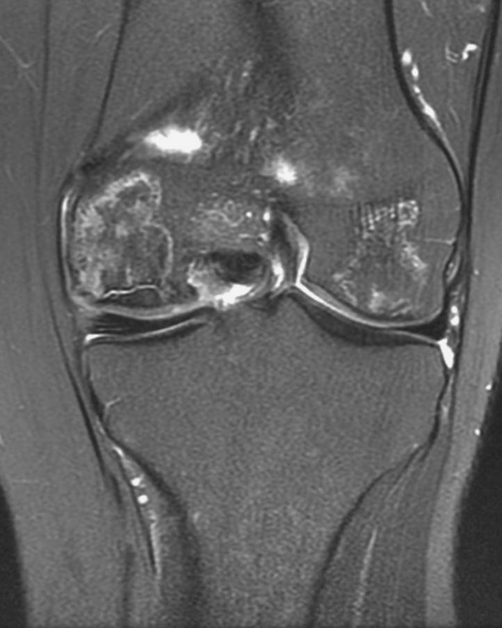 Для некроза наиболее характерно поражение надмыщелков коленного сустава, расположенных в области дистального отдела бедренной кости. Иногда в некротический процесс вовлекается надколенник или бугристость большеберцовой кости. Остеонекроз приводит к постепенному разрушению губчатой костной ткани. Со временем у больного гибнет костный мозг и возникает коллапс костных поверхностей.