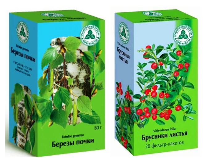 - в маленькую кастрюлю положить по 2 чайные ложки брусничных листьев и березовых почек, влить литр горячей воды. Довести до кипения, томить 15 минут. Остудить, процедить, принимать по 100 мл 3 раза в день после еды.