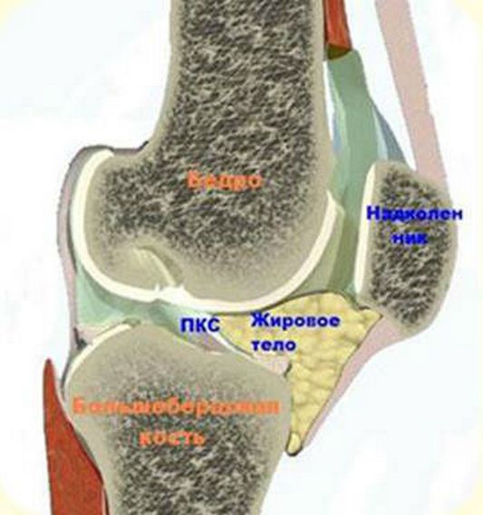 В коленном суставе находится скопление жировой клетчатки, заключенное в прочную соединительнотканную капсулу. Его окружают синовиальная оболочка и собственная связка надколенника. Жировая клетчатка, или тело Гоффа, выполняет амортизационную функцию — равномерно распределяет нагрузки на все суставные структуры. Она препятствует повреждению синовиальной оболочки, косвенно влияет на снабжение хрящевых тканей питательными веществами.