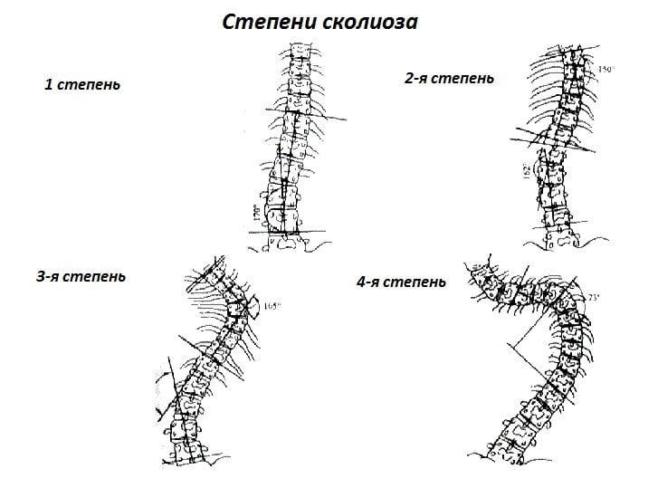 От степени тяжести течения патологии зависит не только характер и выраженность симптоматики, но и используемые методы лечения. Она соответствует определенной стадии сколиоза, выявляемой с помощью рентгенографии.