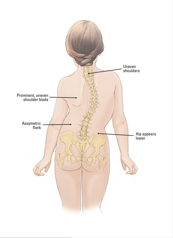 Так как ребенок не жалуется на боли, дискомфорт в спине, то родителям нужно обратить внимание на следующие характерные признаки сколиоза:
