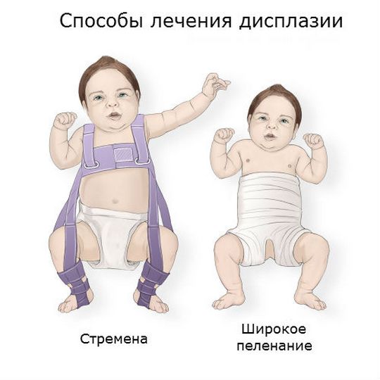 Чем раньше начнется лечение, тем быстрее удастся добиться правильного формирования тазобедренного сустава. Для этого применяются различные методы и средства, помогающие зафиксировать ноги ребенка в положении сгибания и отведения. Это специальное широкое пеленание, стремена, шины и другие приспособления. Чем младше ребенок, тем более мягкими и эластичными должны быть удерживающие ножки ортопедические изделия.