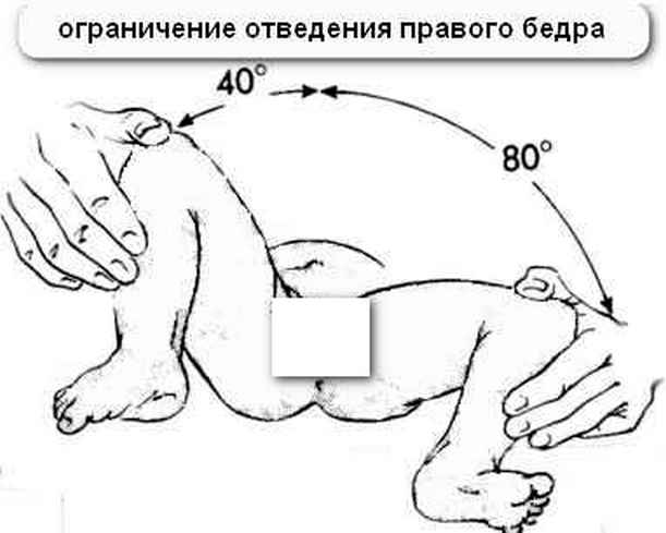 | Ограничение движений | При правильно сформированных ТБС ноги ребенка отводятся до 80-90°, без напряжения укладываются горизонтально. О дисплазии свидетельствует ограничение отведения до угла 50-60 градусов |