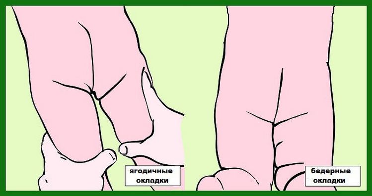 | Асимметрия кожных складок | Ассиметричное расположение паховых, подколенных и ягодичных указывает на дисплазию только у детей старше 3 месяцев. Симптом не всегда информативен. При двустороннем поражении ТБС складки бывают симметричными. У детей до 3 месяцев асимметрия вполне физиологична |