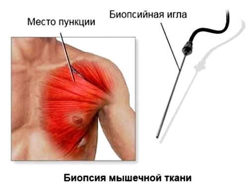 Биопсия — метод забора биологических образцов с исследовательской целью. Основной задачей этого диагностического мероприятия при миозите любой этиологии становится обнаружение дегенеративных изменений мышечных тканей, окружающих их соединительнотканных структур, мелких кровеносных сосудов. Биопсия показана пациентам при подозрении на развитие у них следующих форм мышечного воспаления: