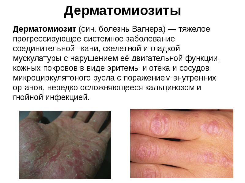К идиопатическим миозитам относится и дерматомиозит. Это диффузное воспалительное заболевание соединительной ткани с прогрессирующим течением. Для дерматомиозита характерно поражение гладких и поперечнополосатых мышц с нарушениями двигательных функций, вовлечением в патологический процесс кожи, кровеносных сосудов и внутренних органов.
