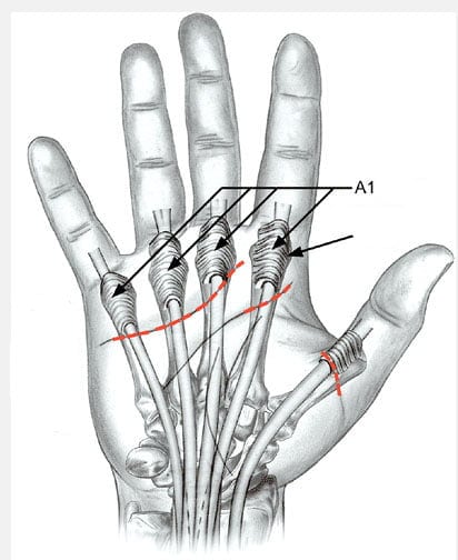 Ответственные за сгибания кистевые сухожилия располагаются в углублениях, покрытых синовиальными оболочками. В них постоянно вырабатывается густая жидкость для смазки и смягчения структурных элементов. Она облегчает их скольжение при любой двигательной активности кисти. У основания пальцев и около фаланг расположены связки, прочно удерживающие сухожилия. Они образованы плотными фиброзными тканями — основными составляющими оболочек влагалищ сухожилий. Под воздействием провоцирующего фактора слаженная работа связочно-сухожильного аппарата нарушается: