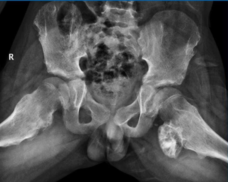 На рентгенографических изображениях хорошо просматриваются измененные контуры бедренной кости. Визуализируются и очертания новообразования — четкие, непрерывные. С помощью рентгенологического исследования не удается рассмотреть сформировавшуюся хрящевую оболочку, только если в ней нет очагов кальцификации. При подозрении на укрупнение хрящевого слоя пациентам назначается МРТ.