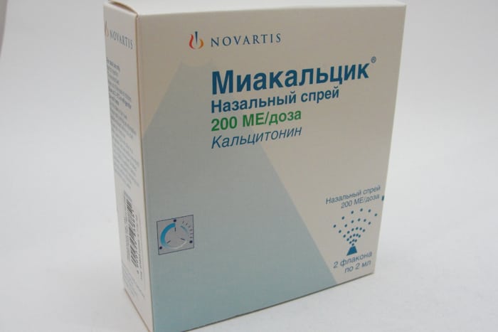 - препараты с кальцитонином, обычно Миакальцик. Предназначен для купирования острых и хронических болей, также угнетает костную резорбцию, оказывает гипокальциемическое действие, увеличивает (на 1-2%) минеральную плотность костной ткани, особенно в поясничных позвонках;