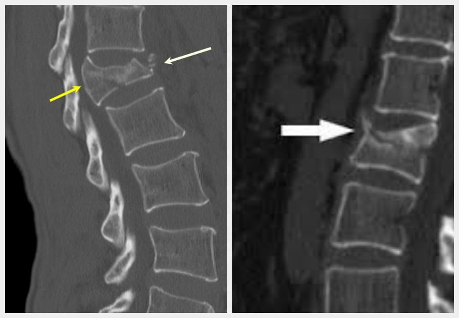 Ведущий симптом остеопороза позвоночника — спонтанный перелом позвонка, не коррелирующийся с тяжестью травмы. Поэтому при повреждениях, не сопровождающихся болью, врачи сразу предполагают снижение костной массы. Когда переломы позвонков поясничного или грудного отдела происходят в результате даже статических нагрузок, пациент обследуется на наличие метастазированных новообразований, «забирающих» кальций из всего опорно-двигательного аппарата. Формирование опухолей, особенно злокачественных, сопровождается специфической симптоматикой.