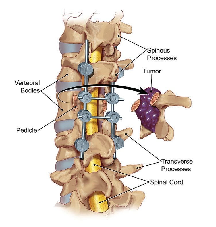 Хирургическое вмешательство наиболее результативно при незначительных размерах новообразования. Технически такая операция будет менее сложной, ниже и вероятность травмирования кровеносных сосудов, нервов, спинного мозга. Практикуется одноэтапное удаление новообразования частичной резекцией или полным иссечением поврежденных позвонков. В ходе операции позвоночник стабилизируется с помощью установки аутотрансплантатов, аллотрансплантатов или металлических пластин.