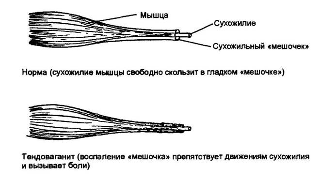 Сухожилия предплечья являются соединительнотканными структурами; в отличие от связок они неэластичны. При любом движении мышц верхней части руки сухожилие смещается, но не растягивается. Поэтому травмы этой части опорно-двигательного аппарата диагностируются редко. Мышцы и сухожилия объединяет особый плотный футляр из соединительных тканей, выстланной внутри синовиальной оболочкой. В ней вырабатывается густая вязкая жидкость, которая обладает амортизационными свойствами. Она облегчает скольжение сухожилия внутри футляра, обеспечивает его плавное смещение относительно расположенных поблизости тканей. При развитии тендовагинита формируются воспалительные отеки, количество синовиальной жидкости уменьшается. Любое смещение сухожилия вызывает сильную, острую боль.