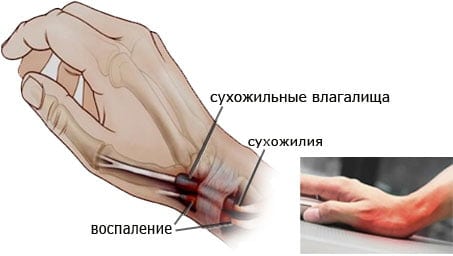 При тендовагините запястья чаще всего воспаляется общее влагалище сгибателей пальцев, которое располагается в карпальном канале. Гораздо реже страдают сухожилия мышцы-разгибателя и длинной отводящей мышцы большого пальца. В большинстве случаев воспаление протекает хронически.