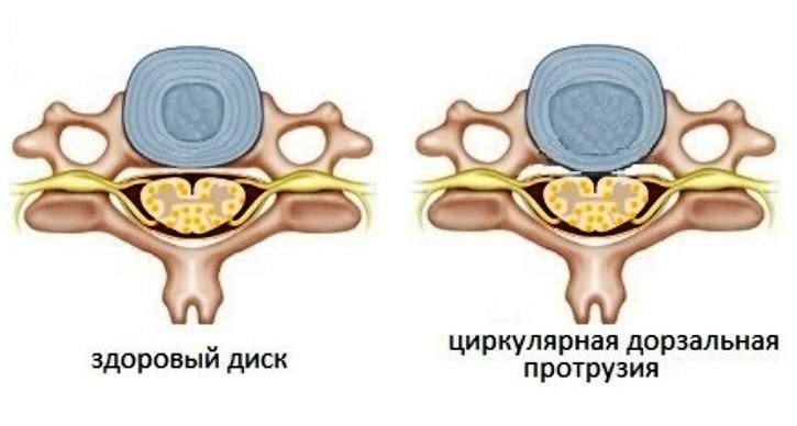 При циркулярно-дорсальной протрузии выпячивание диска происходит к центру спинномозгового канала. При выпирании диска большого размера в патологический процесс вовлекаются спинномозговые ткани. Локализуется протрузия в поясничном отделе позвоночника, клинически проявляется сильными болями, усиливающимися при движении. Они иррадиируют не только в бедра, ноги, область паха и ягодиц. Отраженные боли распространяются на внутренние органы, нередко снижая их функциональную активность.
