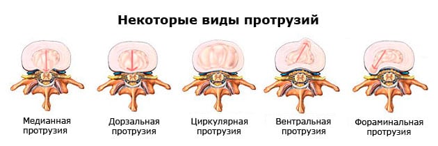 • латеральное, или боковое — выпячивание находится справа или слева, сзади или спереди от позвоночного столба. Протрузией ущемляется один из спинномозговых корешков, определяя сильную выраженность симтоматики. В эту группу включено фораминальное выпячивание пульпозного ядра, направленное в сторону межпозвоночного отверстия;