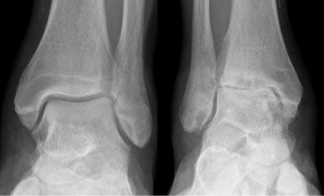 Признаки артроза хорошо визуализируются на рентгенологических снимках. Наблюдается сужение или сращение суставной щели, объединяющей берцовую и таранную кости. Это свидетельствует о значительном поражении всех хрящевых тканей. Методы консервативной терапии тут безрезультативны. Если сохранить сочленение артроскопическими методами лечения (санацией, трансплантацией хрящевых тканей) невозможно, то проводится эндопротезирование голеностопного сустава — его полная замена искусственным протезом.