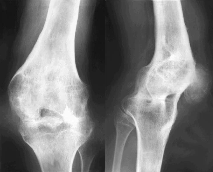 Болезнь «съедает» здоровые хрящи с разной скоростью, в зависимости от уровня физической подготовки, иммунной устойчивости, сопротивляемости организма. В первые несколько месяцев при своевременном обращении к терапевту ситуацию можно стабилизировать (не ликвидировать очаг, а остановить разрушительное движение). В любом случае терапия – не панацея, а только отсрочка. Недоедание, стресс, вредные привычки – гарантия, что рано или поздно понадобится эндопротезирование суставного сегмента. На фото стадии артроза колена выглядят так: