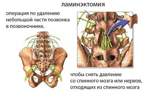 Ламинэктомия – операция, в ходе которой производится удаление дужки позвонка под общим наркозом или местной анестезией. Хирург делает разрез вдоль остистых отростков длиной около 3 см, отодвигает мышечные ткани. Сначала он удаляет остистый отросток, затем резецирует одну или две позвонковые дужки.