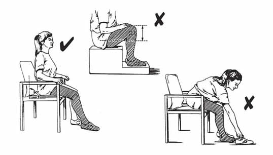 • после выписки домой можно приседать только на высокие стулья, а поднимать предметы без посторонней помощи или специальных приспособлений запрещено;