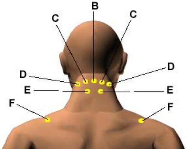 - давление на точку от 2 до 3 с минут для расслабления спазмированной скелетной мускулатуры и повышения объема движений в шейном отделе;