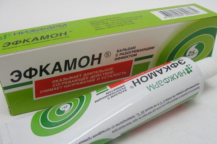 - Эфкамон (от 115 руб.). Мазь с многокомпонентным составом, включающим камфору, метилсалицилат, эфирные масла гвоздики и эвкалипта, натуральное горчичное масло, ментол, экстракт жгучего красного перца. Эфкамон назначается врачами пациентам для снижения мышечного тонуса, спровоцированного спазмом, усиления кровообращения в очагах патологии, улучшения тканевого питания, предупреждения распространения воспаления на здоровые ткани. Эфирные и косметические масла способствуют быстрой трансдермальной абсорбции активных ингредиентов, оказывают выраженное антисептическое и бактерицидное действие.