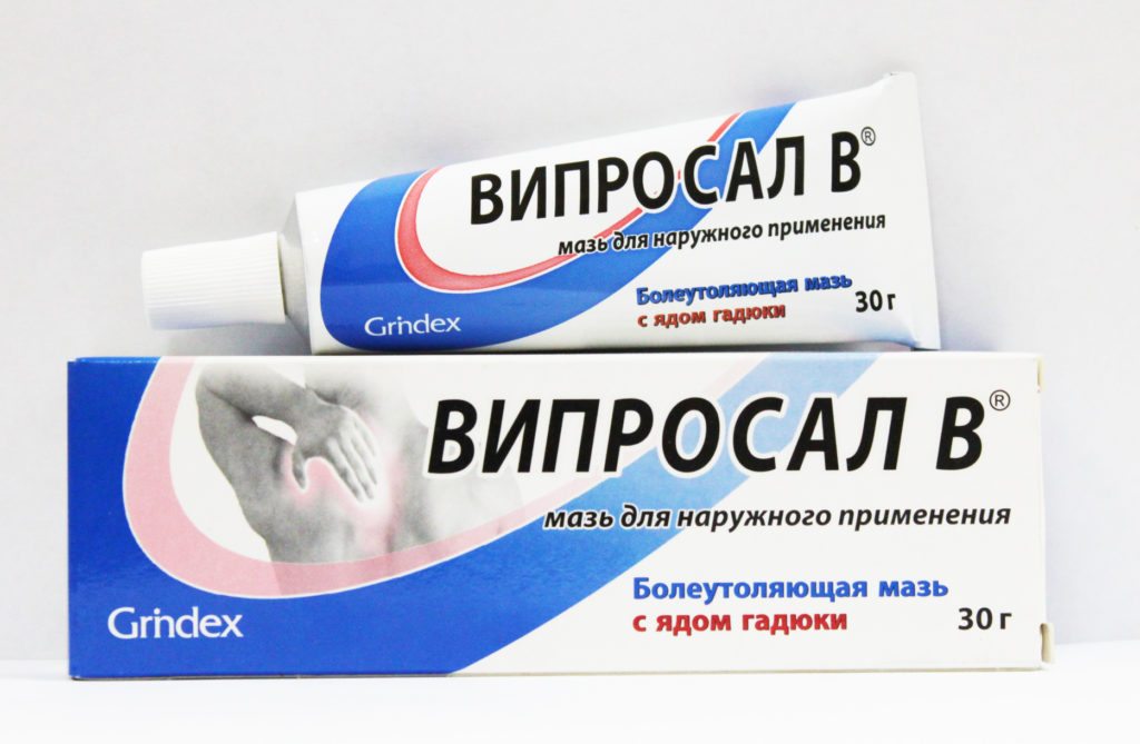 - Випросал (от 255 руб.). Мазь содержит камфору, салициловую кислоту, живичный скипидар и яд гадюки. Средство для локального нанесения быстро купирует хронические воспалительные процессы, снижает интенсивность болевого синдрома. Все действующие вещества мази Випросал оказывают анальгезирующее, противоотечное и расслабляющее действие. Стойкое расширение кровеносных сосудов позволяет вывести из пораженных воспалением суставов шлаки и токсичные соединения, улучшить трофику тканей. Для камфоры характерно и отвлекающее действие за счет раздражения рецепторов, расположенных в подкожной клетчатке и верхних слоях эпидермиса;