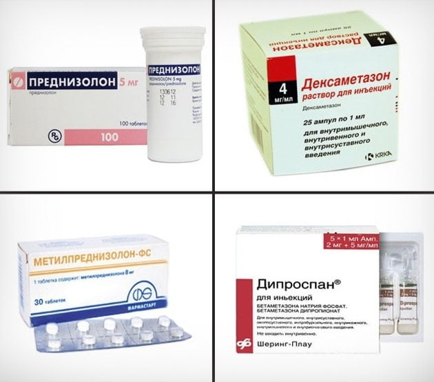 Кроме противовоспалительного действия, для гормональных препаратов характерна противоаллергическая и иммуносупрессивная активность. Для быстрого купирования боли и воспаления рекомендовано внутрисуставное введение глюкокортикостероидов. Дозировки инъекционных растворов и таблеток подбираются индивидуально. В начале терапии применяются высокие дозы препаратов. Они равномерно распределяются на несколько приемов в течение суток. Постепенно переходят к однократному введению глюкокортикостероидов в утренние часы.