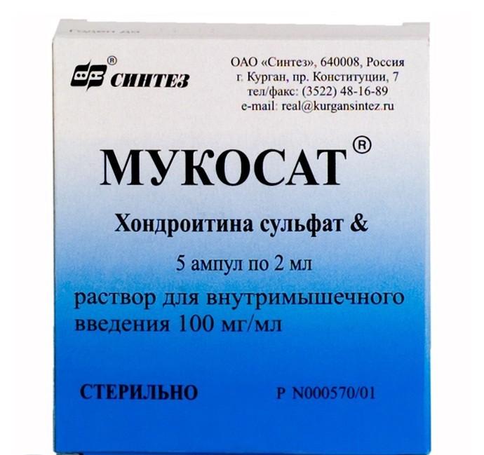 • Мукосат. Выпускается в виде таблеток, капсул, инъекционных растворов. Показания — артрозы, остеоартрозы, радикулит. Препарат рекомендован для быстрого восстановления тканей после переломов, вывихов, растяжений. В первые три недели необходимо принимать по 3 таблетки, на протяжении остального срока лечения — по 2 таблетки. При тяжелом течении заболевания в начале терапии назначаются инъекционные растворы Мукосат.