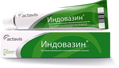 - Индовазин. В состав геля входят нестероидное противовоспалительное средство индометацин и венопротектор троксерутин. Применение Индовазина способствует снижению выраженности болевого синдрома и улучшению кровообращения.